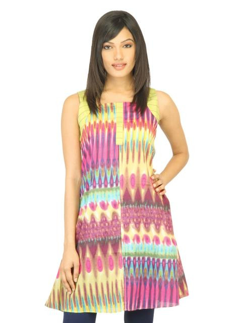 Multi-coloured kurta made of 100% cotton, has square neck and broad armhole piping with pintucks which forms the straps over the shoulder, panel stitch from the neckline and patterning all over