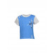 Blue round neck t-shirt made of 100% cotton, with grey ribbed neckline, grey sleeves, twill tape detailing with studs on the right shoulder and left hem, and with graphic with stud detailing on the left side