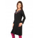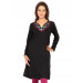 Black round neck kurti made of 100% acrylic, has a slit neck with pink and green floral emboidery, full sleeves, and a vented hem