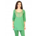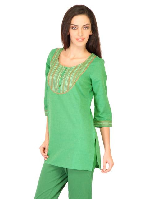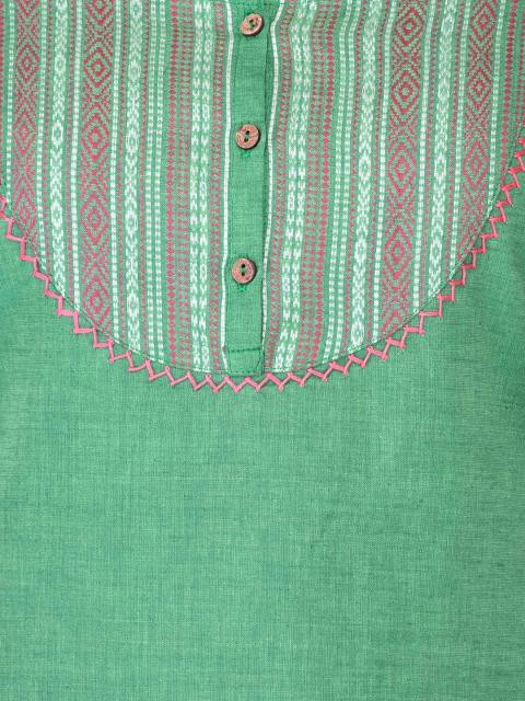 Woven light green kurti made of 100% cotton, has three-quarter sleeves, round neck with a buttoned chest placket, woven panel border on the sleeve hems, woven round panel that extends till the bust with a stitched border, and a vented hem