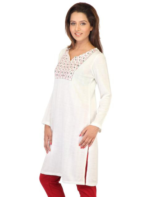White round neck kurta made of 100% acrylic, has a slit neck with white, black, red and silver thread embroidery around the yoke, full sleeves and a vented hem