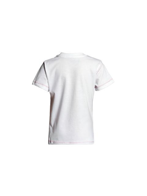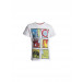 White T-shirt, has a round ribbed neckline, short sleeves and graphic Avengers print in front