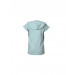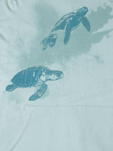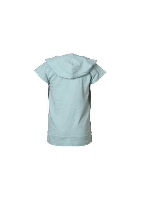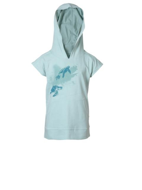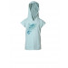 Blue T-shirt, has a hood, short sleeves, graphic print on the front, two connected pockets in front and print at the back with stitched detail