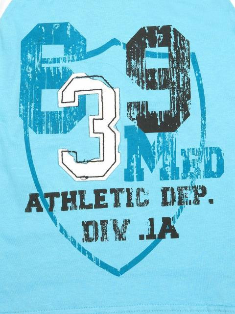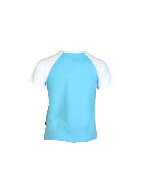 White and blue round neck t-shirt made of 100% cotton, with short raglan sleeves and graphic print on the front