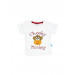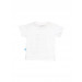 White round neck short sleeved t-shirt made of 100% cotton, ribbed neckline with fabric tape detailing on the inseam, graphic print on the front with lettering and brand tab appliqued on the side