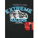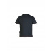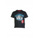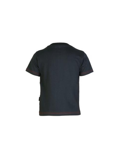 Black round neck t-shirt made of 100% cotton, with short sleeves, red stitch detailing on the sleeve and shirt hems and graphic print on the front