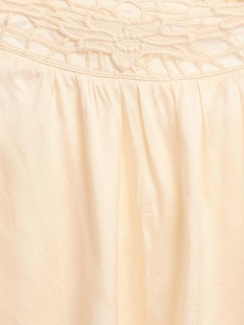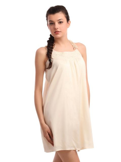 Cream strappy A-line dress, has tie up shoulder straps attached to a small panel on the centre back, lace panel in front below the neckline, gathers at the back neckline and below the lace panel in front and a lining inside