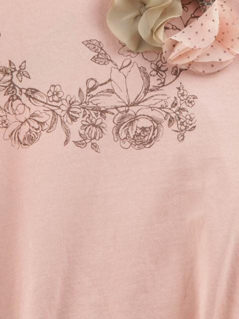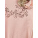 Pale pink sheath dress, beaded and printed floral detail at front neck, rosette detail, round neck with lace trim, cap sleeves, three pleats at front and back side seam, thigh length