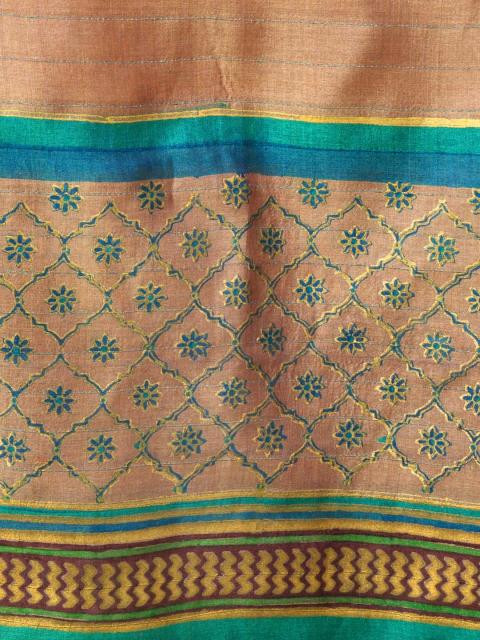Burnt orange tussar printed kurta with hunar texture, has tassels on the ends