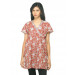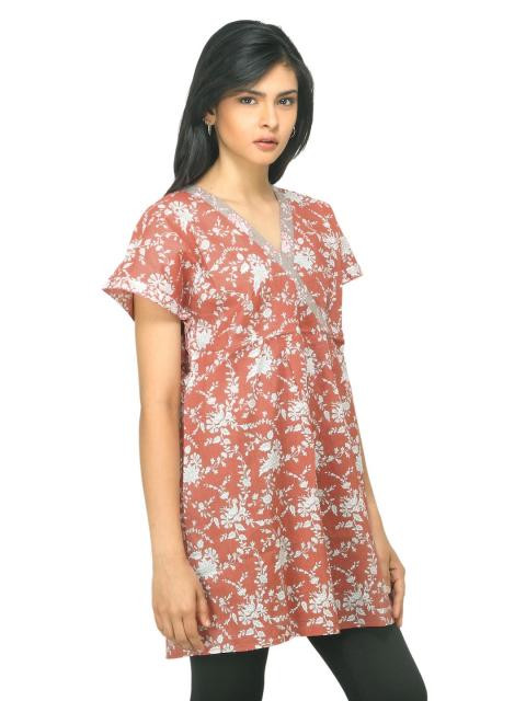 Rust printed tunic, made of cotton fabric, has a ballet wrap neckline, dolman sleeves and slightly pleated at the waistline