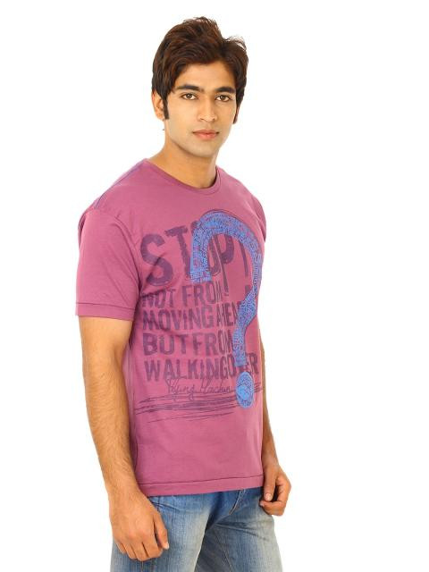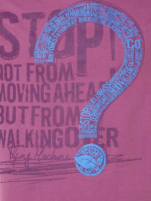 Upgrade your cool quotient with this mauve t-shirt from the Resident Earth collection from flying machine. The distressed print on the chest and the words,"Stop! Not from moving ahead but from walking over!" adds a dash of urban style coupled with global consciousness. Team it with jeans and canvas shoes for a really laidback look.