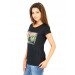 Black round neck T-shirt made of 100% cotton, has short sleeves and graphic print on the front