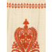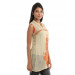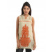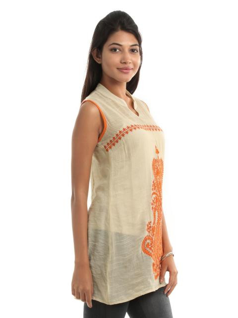 Beige sleeveless tunic, has a mandarin collar with a split V neckline, orange embroidery in front and orange piping around the arm holes