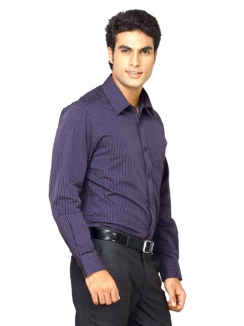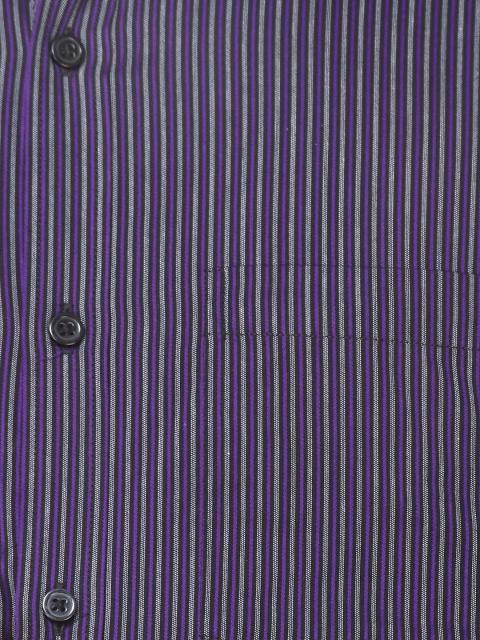 Purple and grey striped shirt, has a spread collar, full buttoned placket, long sleeves with buttoned cuffs, patch pocket on left chest and curved hem