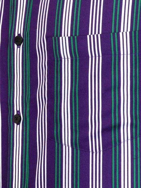 Purple full sleeves shirt with green and white stripes, made of 100% cotton, has a patch pocket on the left chest and a full length buttoned placket