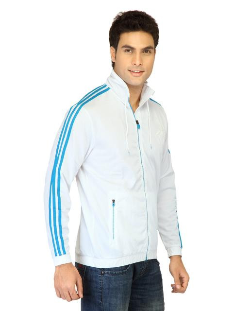 Look cool on and off the Sports field in this white track jacket from adidas. The iconic three stipes on the sleeves and the brand tab adds to the style quotient, while the rubber print on the side of a funky pop art piece gives this jacket some serious street cred. Team this with tracks, tees and performance shoes for gym sessions and other sports.