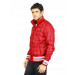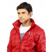 Red check jacket with the shell and lining made of 100% polyester, has full sleeves with ribbed cuffs, mock collar with ribbing, zippered front placket, rubber printed branding on left chest, a zippered pocket on the right chest, two zippered pockets on the sides, ribbed hem, stripes on the cuffs and hemline