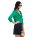 Green polka dotted woven jacket, notch collar with tucks, three quarter sleeves with gathers at the shoulder and facing at the hem,placket with two white buttons, buttoned tab at the back, inverted box pleats that open out below the waist, metal brand badge near front hem