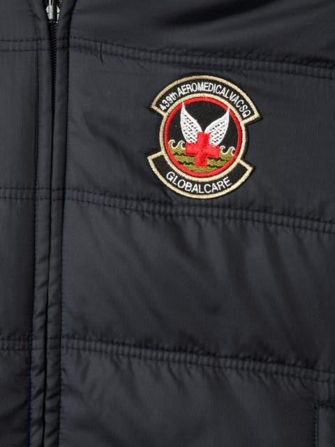 Blue and red quilted reversible jacket with a hood, padded interlining, long sleeves with elasticated ribbed cuffs, detachable zippered front, two welt pockets &ndash each on the front and inside, yoke at the back, badge at left chest