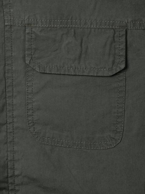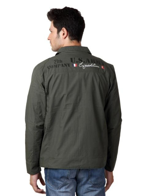 Olive jacket with a buttoned spread collar, long sleeves, detachable zippered front, buttoned placket covering zipper, four pockets with buttoned flap on the front, inner welt pocket on the left chest, yoke at the back and  branding inside