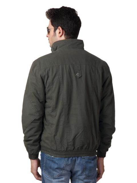 Olive green quilted jacket with a mock collar, panel and stitch overlays, padded interlining, long sleeves with elasticated smocking at the cuffs, detachable zippered front, three pockets with a buttoned flap on the front, inner welt pocket on the left chest, yoke at the back with a mock button tab, branding inside, elasticated smocking at the hem for a snug Fit