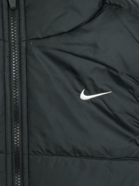 Black sleeveless reversible quilted jacket made of 100% polyester, has a mock neck, thermal lining, grey graphic pattern on the reverse side, insert pocket on the sides, zippered closure on the front and embroidered swoosh on the upper left chest
