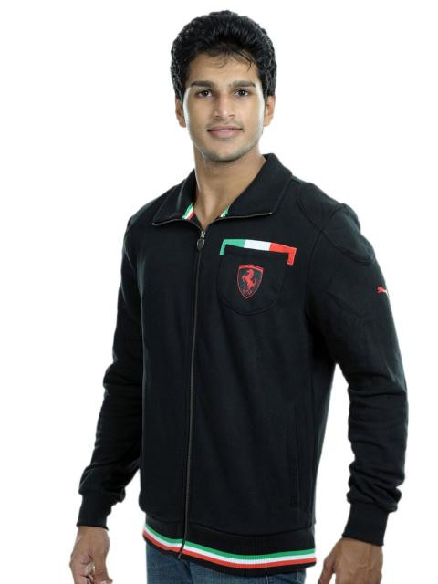 Black jacket made of blended fabric, has full sleeves with ribbed cuffs, full front zippered placket, spread collar, a patch pocket on the left chest, ferrari branding on left chest, Italy's flag colours above the pocket and at the hemline