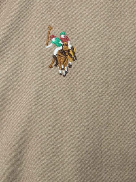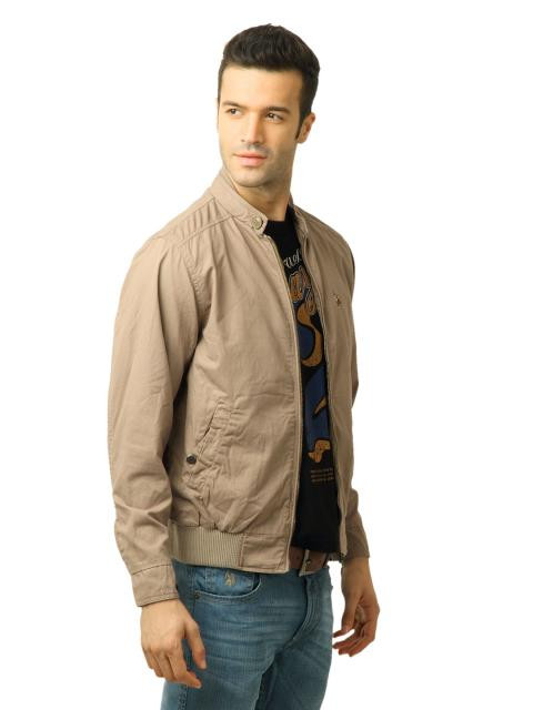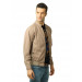 Khaki jacket made of 100% cotton, has full sleeves with buttoned cuffs, mock collar with a button closure and knitted inner collar, zippered front closure, embroidered branding on the left chest and two front pockets with button closures