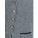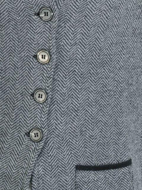 Grey knitted jacket with herringbone pattern made of 80% lambswool and 20% nylon, has full sleeves, a peaked lapel, a buttoned closure with plastic tortoise shell buttons, and two patch pockets on the waist