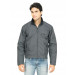 Grey jacket made of nylon, has a mock collar, long sleeves with Velcro closures on the cuffs, full zippered pocket, two pockets on the sides and stitch detailing