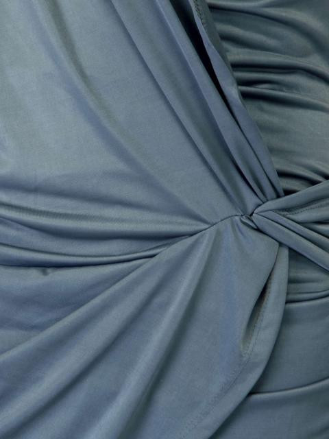 Grey tunic made of 100% polyester, sleeveless, has a shawl neck, elasticated detail for a ruched effect at the sides and a flap layer passing through the loop at the midriff