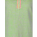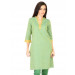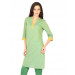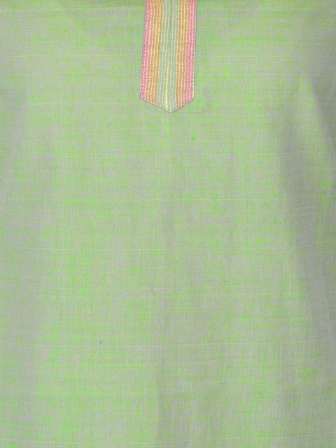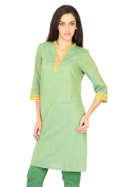 Green and yellow mandarin colllar kurti, made of 100% cotton, has three-quarter sleeves, zari tape detailing around the collar and the edge of the sleeves, and a vented hem