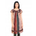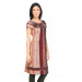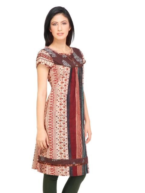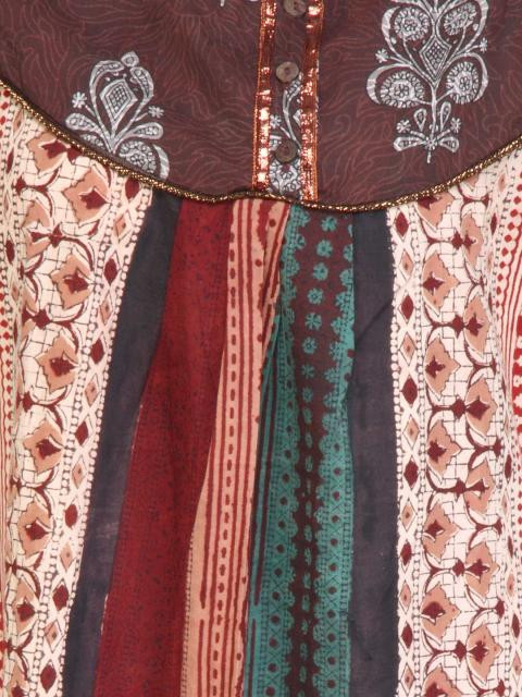 Beige and maroon kurta made of 100% cotton, has a round neckline, short buttoned placket with a yoke and shimmery border, pleats emerging from the yoke and extending till the length of the kurta, and short sleeves with a shimmery border