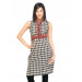 Off white and black mandarin collared sleeveless kurta made of 100% cotton, has a maroon border along the neckline and bustline, and a vented hem