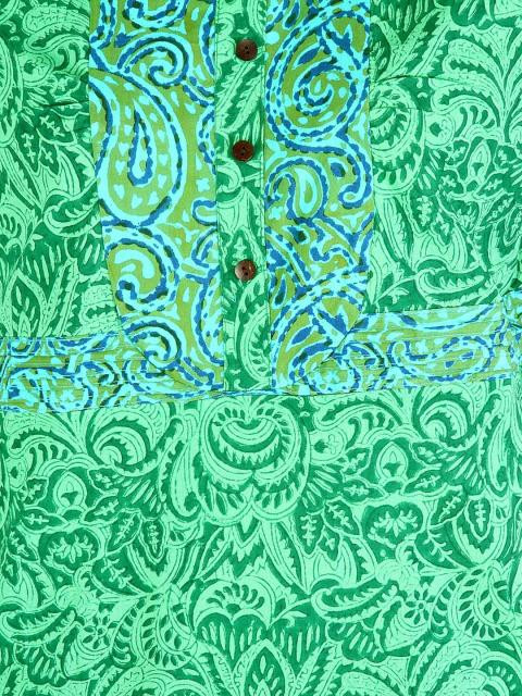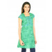 Green screen printed kurta made of 100% cotton, has a square neck with a buttoned chest placket, cap sleeves, hint of blue in the sleeves and on the strip detailing on the chest, and has a vented hem