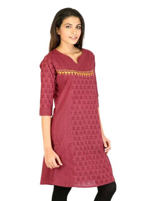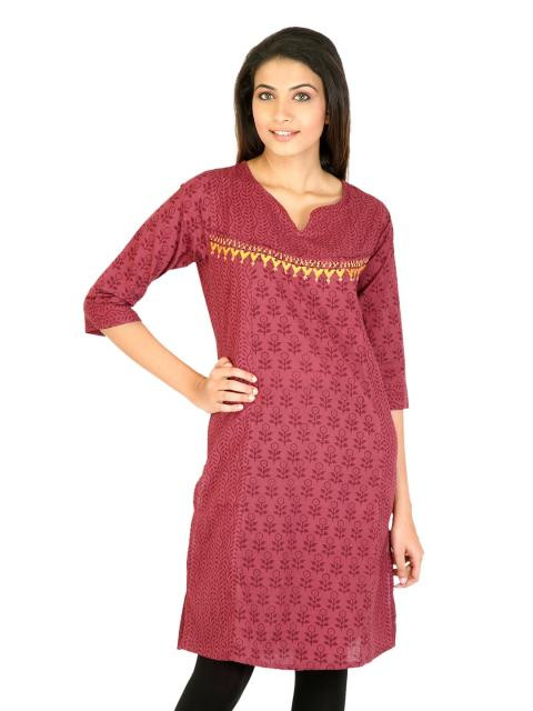 Red screen printed kurta made of 100% cotton, has a slit neck, three-quarter sleeves, embroidery along the bustline and a vented hem