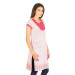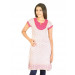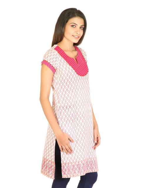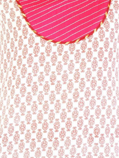 White kurta with screen print, made of 100% cotton, has short sleeves with fuchsia pink piping at the hem, fuchsia pink bib with white stitch detailing, round slit neck and a vented hem