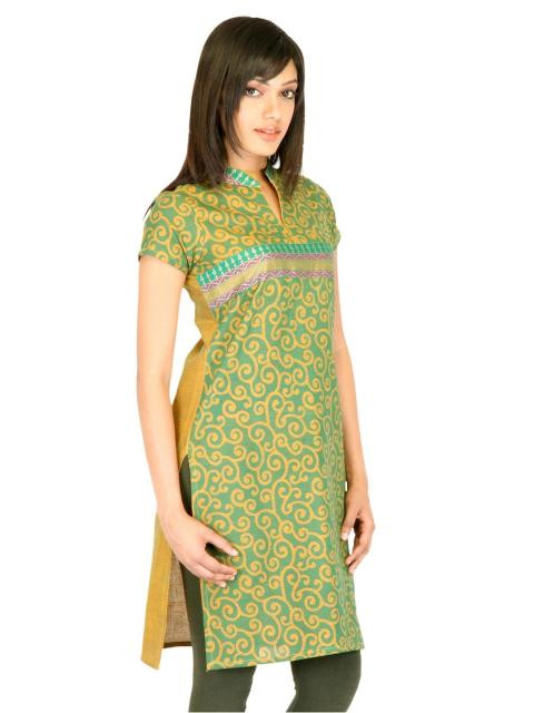 Upgrade your casual look with this chic kurta from vishudh! The green and mustard yellow fabric and the brocade detailing adds a festive touch grey kurta, while the cotton and silk blend fabric keeps you fresh and comfortable all day long. Team it with leggings or a white loose kameez and gold sandals for a chilled out look.