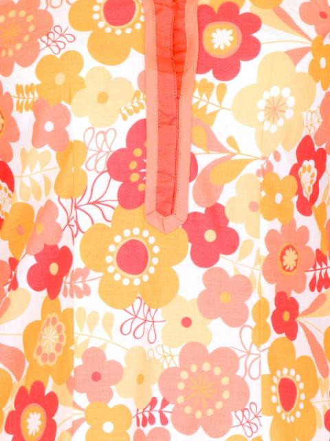 Printed kurta made of 100% cotton, that has a peach, pink and orange floral pattern, mega sleeves, mandarin collar with a split neckline and extended placket with hook closures, coral pink paneling on the collar, sleeve hems and and on the placket and slit side hems