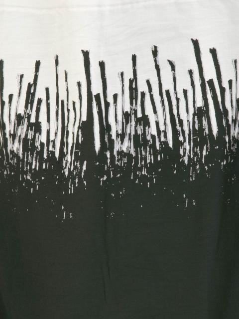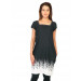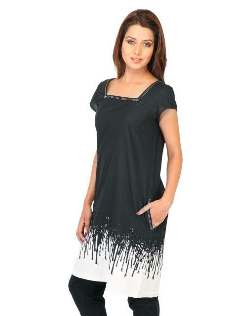 Black kurti made of 100% cotton, has a square neck with white thread detailing, print in white above the hem and has side slits