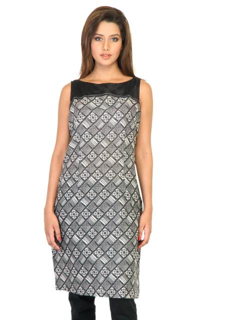 Black and white sleeveless kurti made of 100% cotton, has an upper panel in black silk and side slits