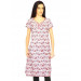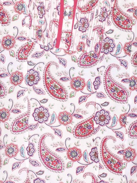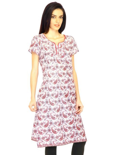 White printed kurta made of 100% cotton, with short sleeves, has a round slit neck with red piping that extends into a buttoned chest placket, has pintucks along the front centre chest and split side hems