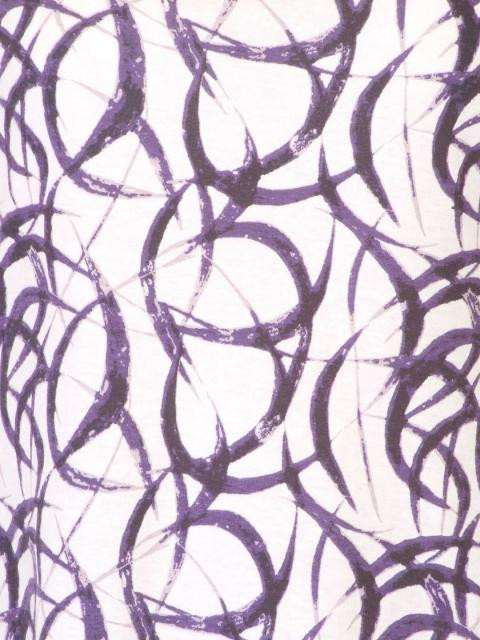 White sleeveless kurta with purple print, made of 100% cotton, and has a round neck with panel strips along the neckline and sleeves
