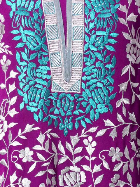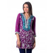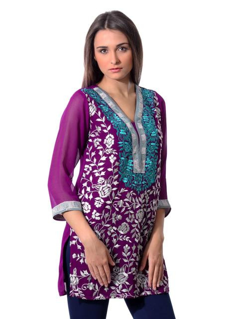 Purple kurta, has a V-neck, embroidery all over, three quarter sleeves and a vented hem
