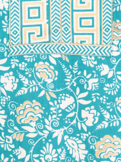 Printed blue round neck kurti made of a blendid fabric, has a split neckline, metallic tones on the yoke and cuffs, three-quarter sleeves and a vented hem