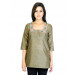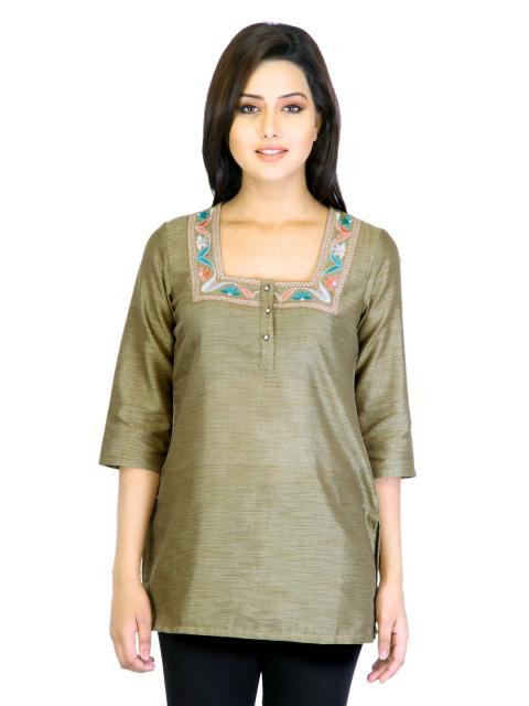 Two tone olive kurti made of a blendid fabric, has a square neck, embroidery around the neckline, half buttoned placket, three-quarter sleeves and a vented hem