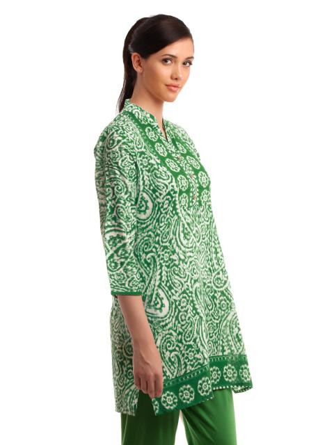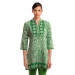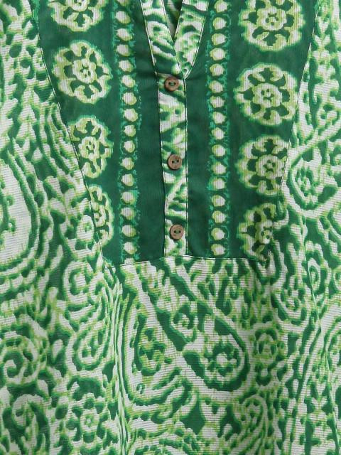 Green printed woven kurti, has a mandarin collar with a split neckline, chest button placket, three fourth sleeves with paneling on the cuffs and a vented hem