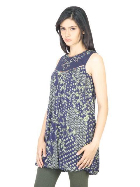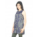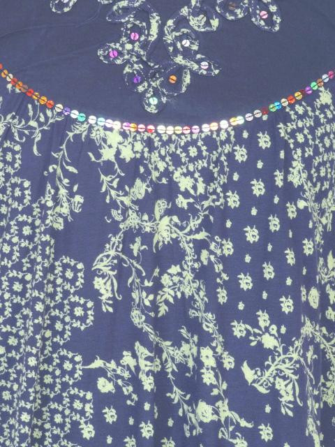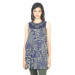 Navy blue printed kurti made of lightweight 100% cotton knitted fabric with stretch, has a woven (non stretch) cotton lining, sleeveless shape, round neck with sequin and stitching embellishments on yoke, fabric gathered to yoke on front and back and hem gathered to lining to create puffed shape