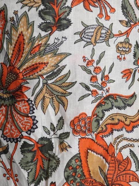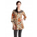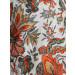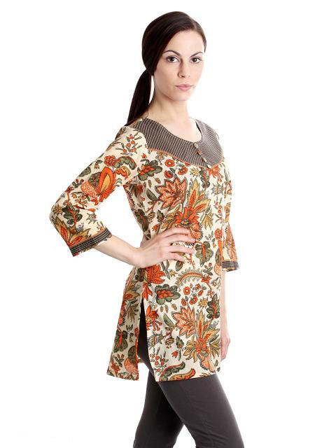 Orange, beige and green printed kurti made of 100% cotton, has three quarter sleeves, round neck, stitch detailing on the chest and cuffs, buttons on the chest and a vented hem