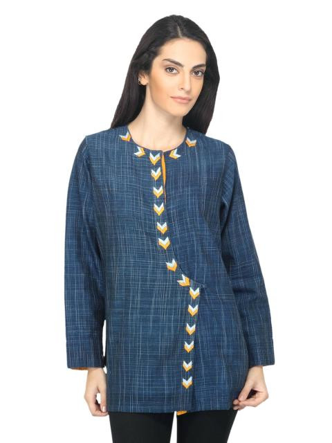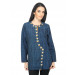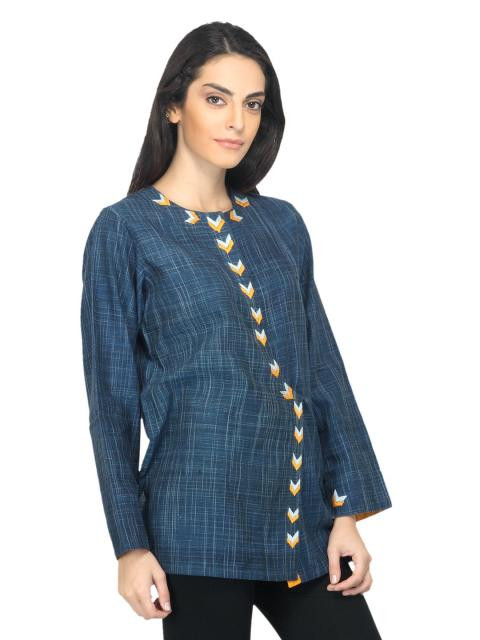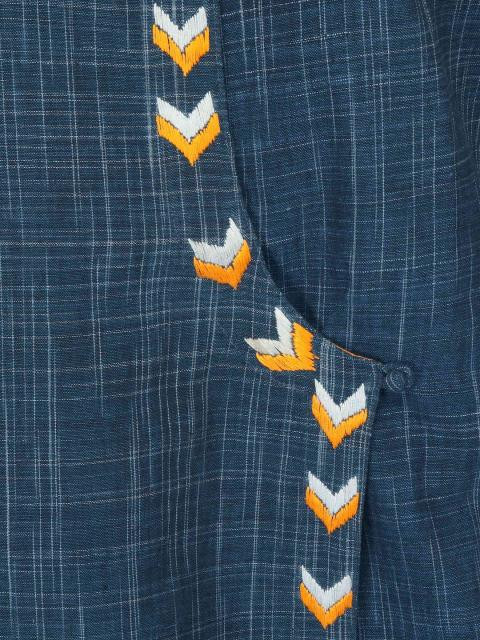 Blue short kurti, made of cotton fabric, has a round neck, long sleeves, embroidery along the neckline and the placket, concealed buttoned placket till the waist, placket extending with a curve and a fabric button, a vent on the front with vents on the sides